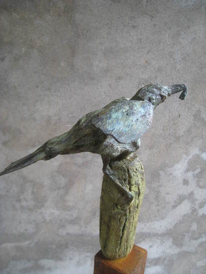 Bronzen bird - merel met voer - "Op de uitkijk". Cire-perdu gegoten. Unica. Bronzen beeld geplaatst op stalen sokkel. Tuinbeeld.